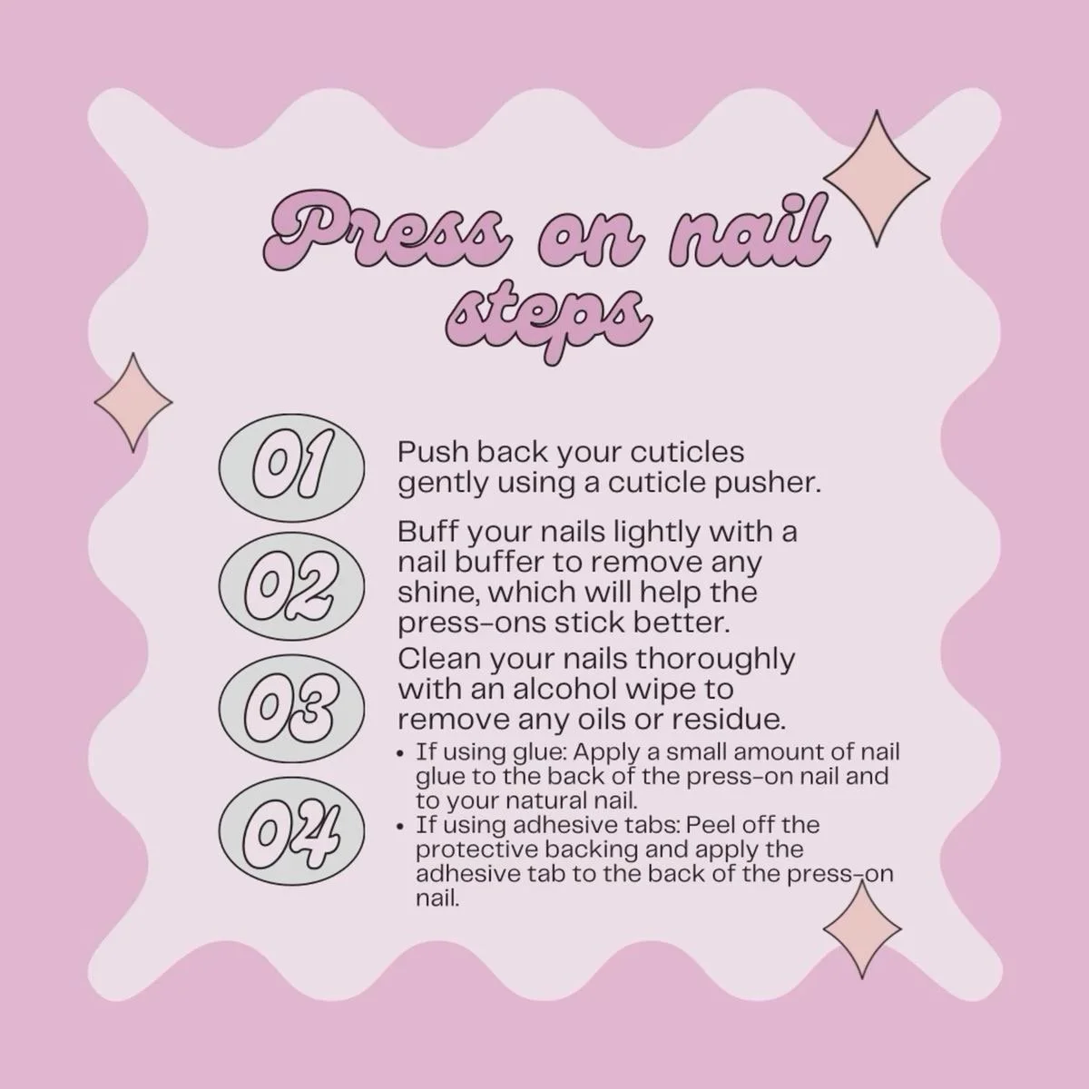⭐️ Comes with Nail Glue, Nail File, Buffer, Alcohol Wipe, Sticky Tabs, Cuticle Pusher, Instructions.